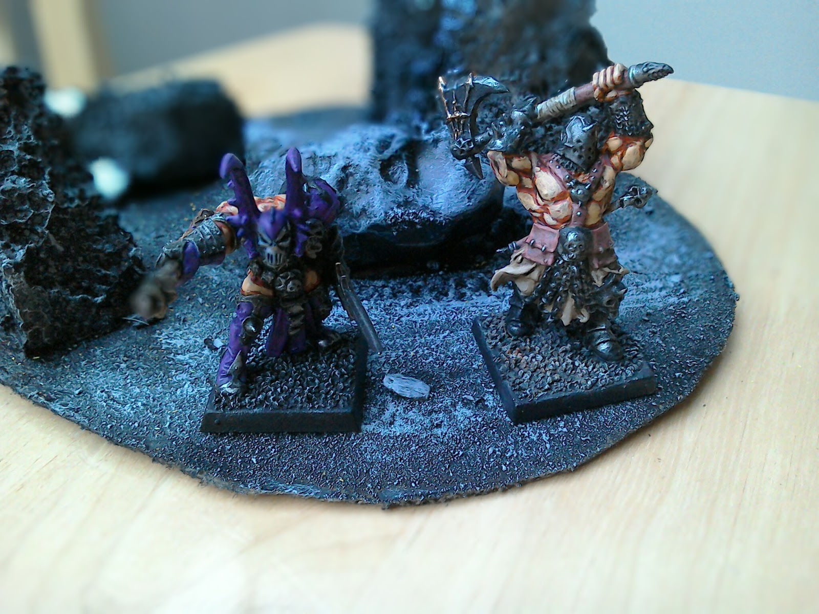 That aside the plan was to play 4 of my warbands against each other in 2 games, "winners" going through to play the other, then the warband left standing facing off against the newly created Chaos Warband. Background fluff loosly based around the news that a maurading Chaos warband were laying waste to local areas and searching for a mystic stone where they hoped to summon a Great Demon. Each warband were searching for magical items to aid them in seeing off this threat but it appears others were thinking the same thing. Apart from maybe the Undead who just wanted (spicy?) Chaos brains for tea.